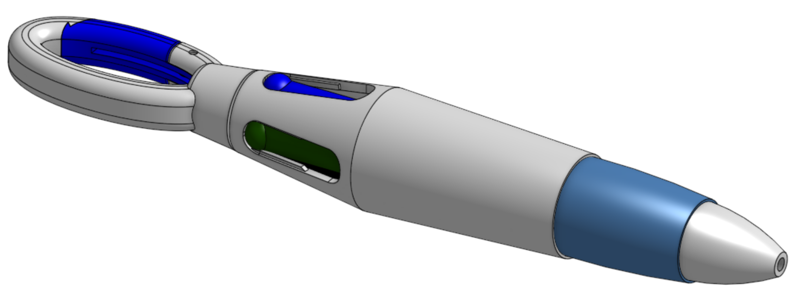 The completed pen assembly, showing the recreated overall form and the integrated functional geometry needed for it to operate like the original product.
