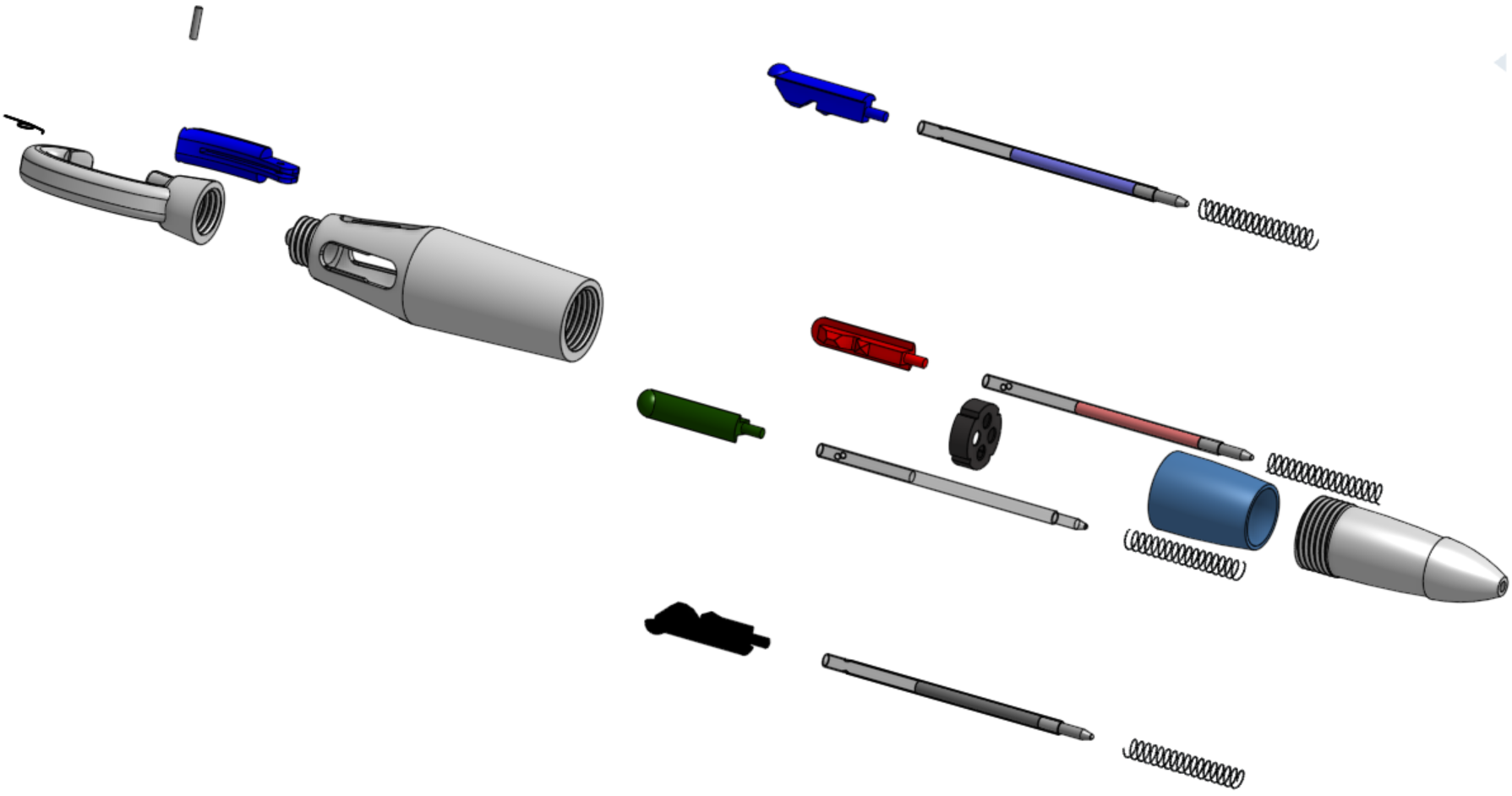 The goal of this project was to reverse engineer a commercially manufactured carabiner pen and recreate it as a fully documented digital model. Rather than only matching the outer shape, the work involved rebuilding the internal parts, assembly relationships, and functional interfaces required for the pen to operate like the original product.