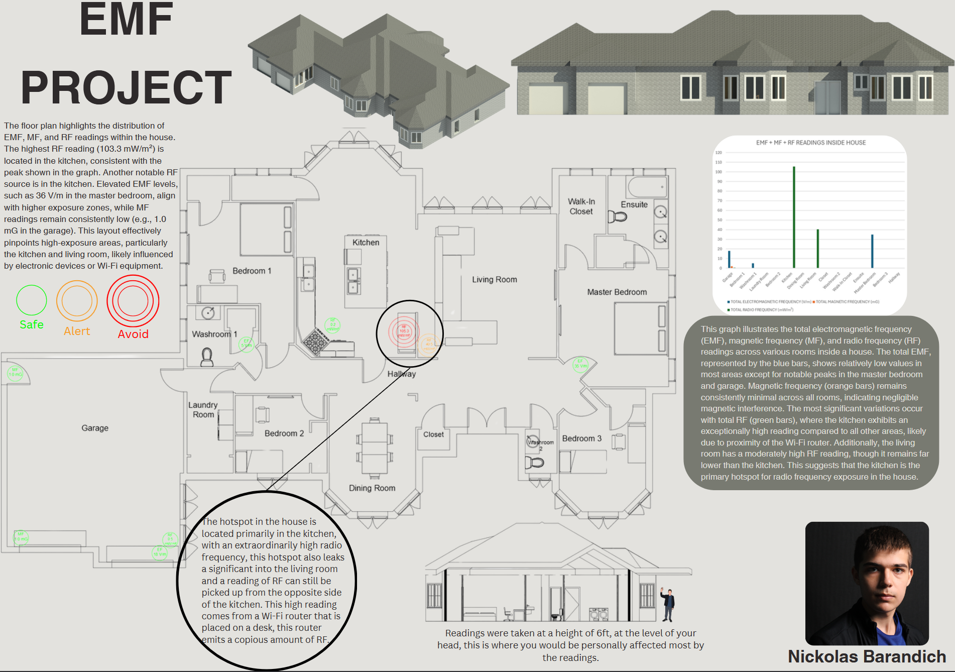 This project was centered on drafting, building modeling, measurement methodology, and analysis. I recreated a fully furnished floor plan of my house in AutoCAD, built a matching 3D Revit model, and used both to organize and explain EMF readings by room and location.